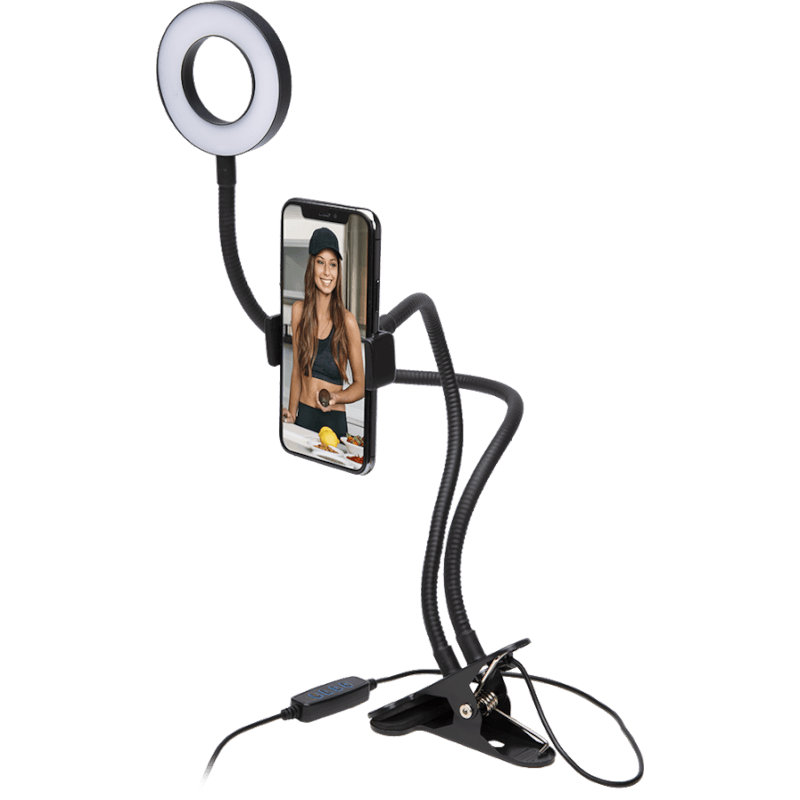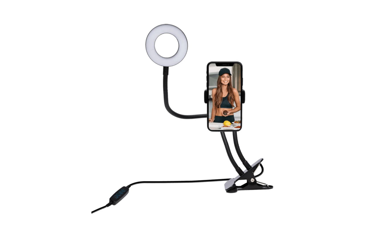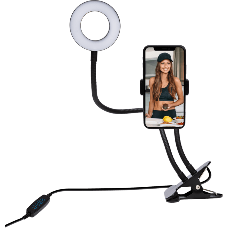 • Zestaw do vlogowania i fotografowania z małą lampą LED. Sprawi, że będziesz dobrze wyglądać podczas spotkań lub wywiadów wideo. Możesz go przymocować bezpośrednio do biurka i prowadzić wideorozmowy za pomocą swojego smartfona. Z łatwością stworzysz wspaniałe zdjęcia i filmy, które pozwolą Ci rozwinąć swoje sieci społecznościowe czy kanał na You Tubie. Dostosuj jasność swoich filmów, używając odpowiedniej intensywności i dostosowując się do każdej sytuacji. 3 poziomy jasności są idealne do nagrywania filmów i robienia zdjęć w każdych warunkach, nawet w najciemniejszych pomieszczeniach w Twoim domu. Zestaw posiada rozciągliwe ramię do 53 cm, dzięki czemu można łatwo dostosować go do każdej pozycji. Wybierz odpowiednią wysokość podczas robienia zdjęć lub nagrywania wideo. Dla dodatkowej wygody możesz obrócić telefon pod wybranym kątem. Uchwyt na telefon umożliwia korzystanie z niego zarówno w poziomie, jak i w pionie.